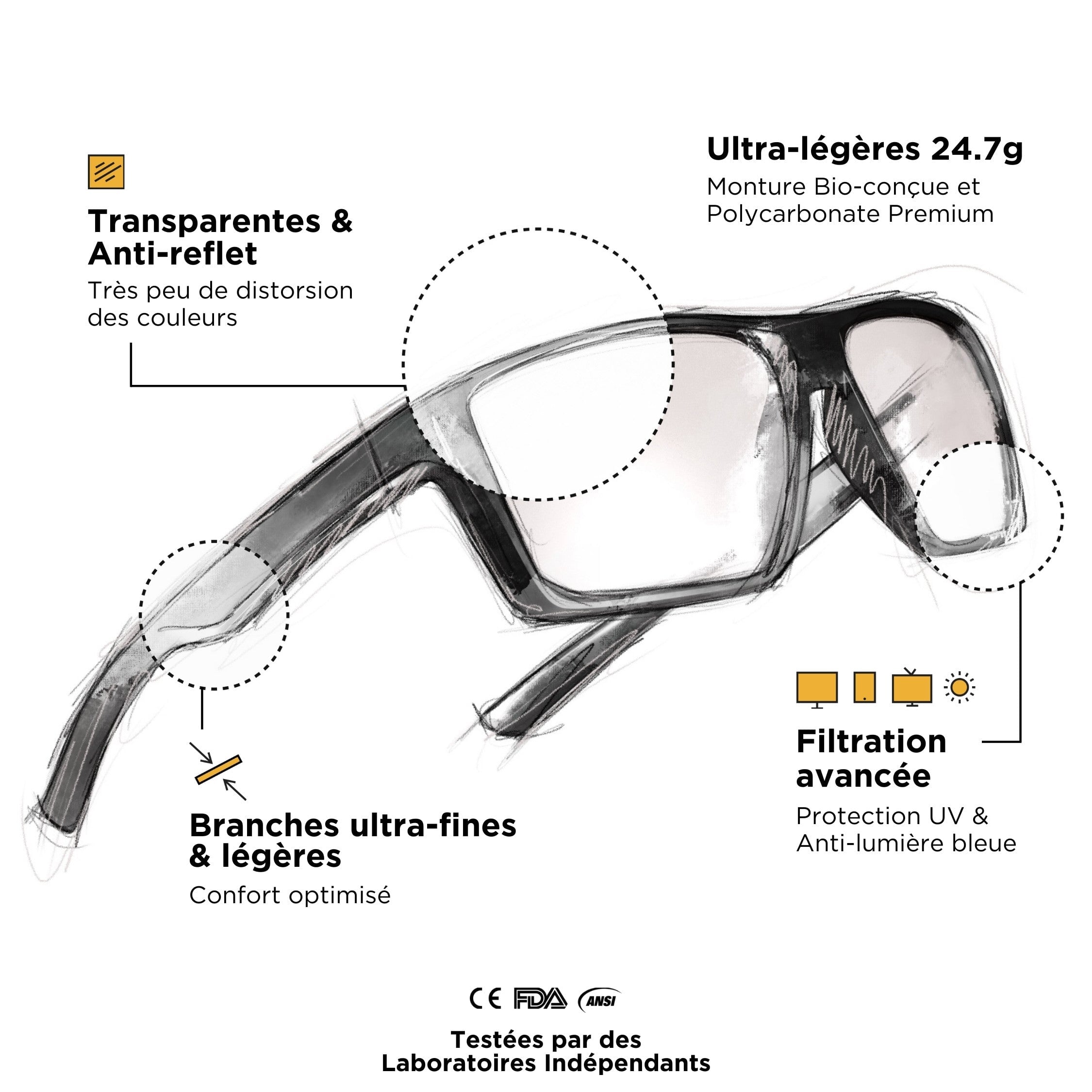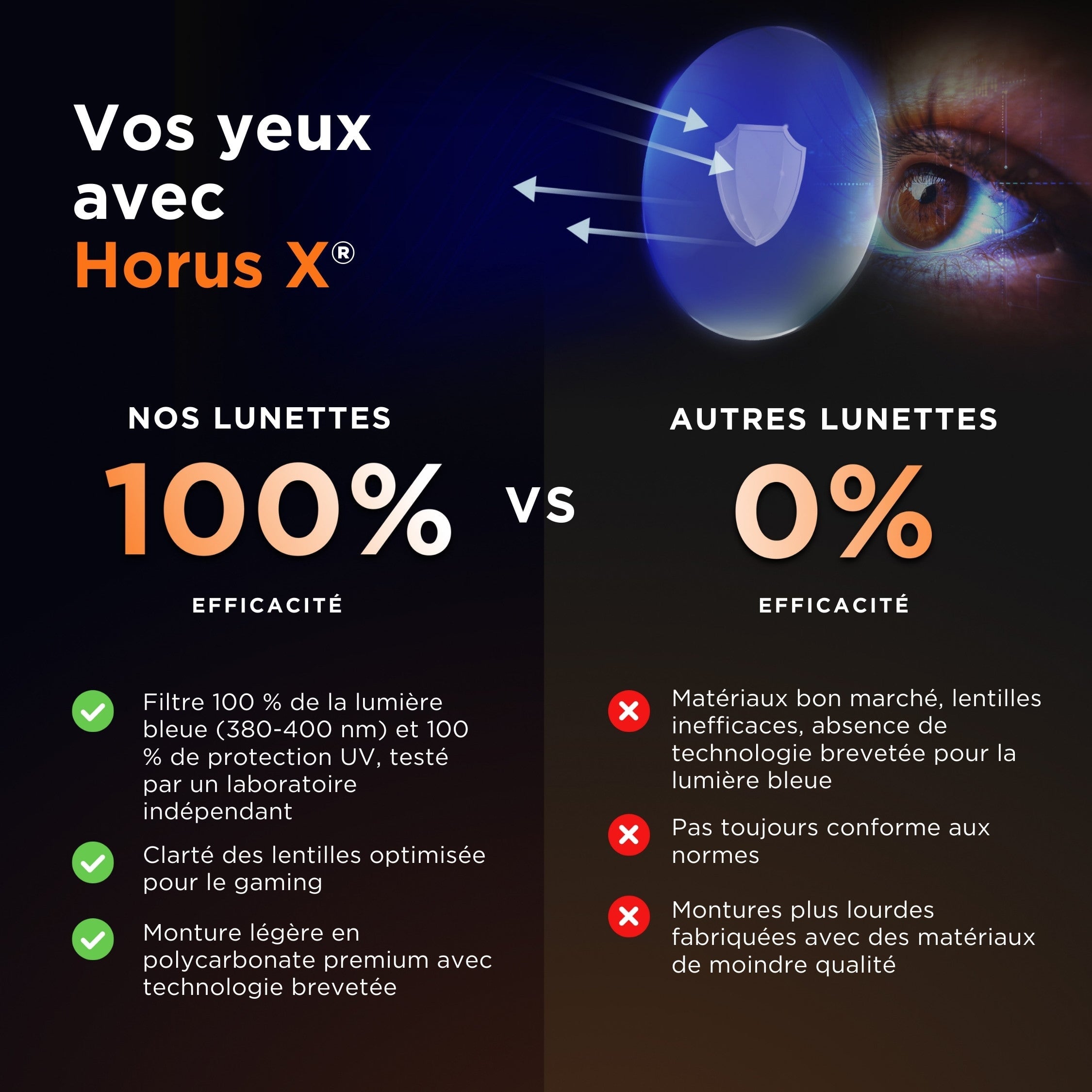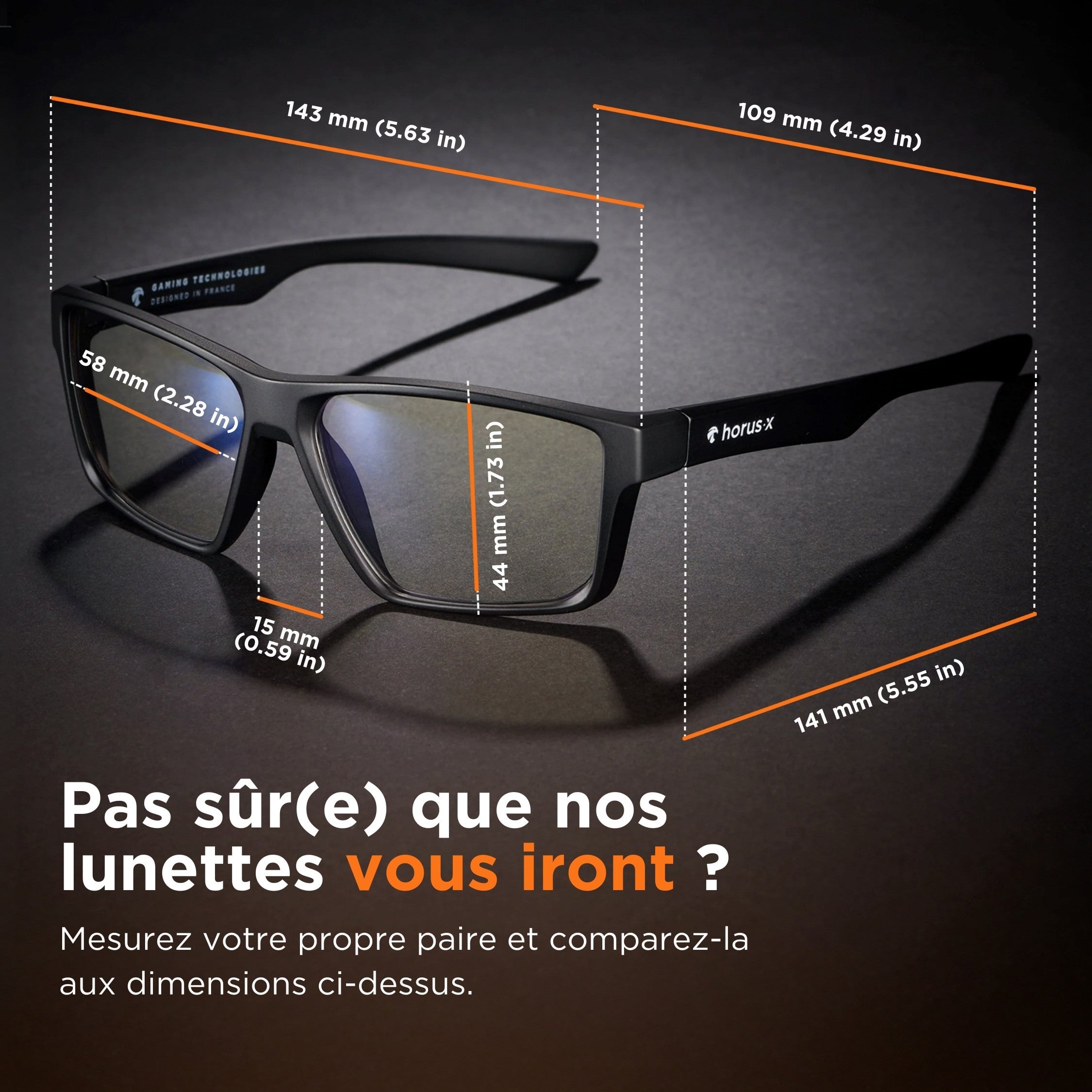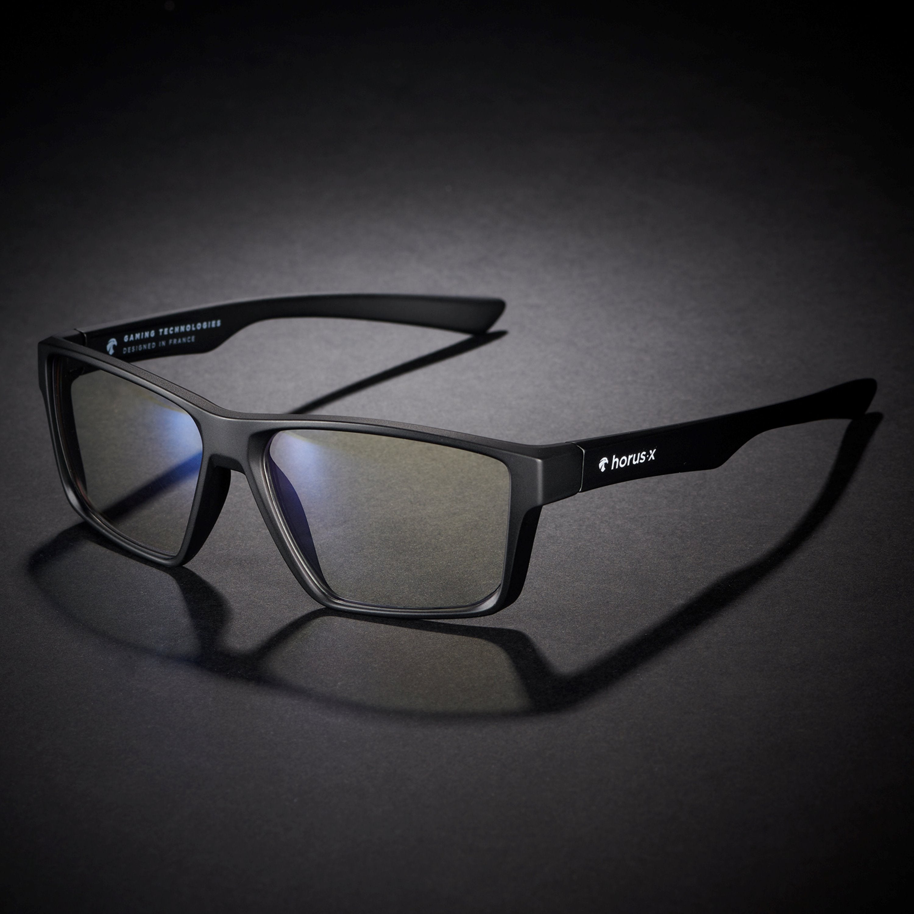 Wir haben sehr hart daran gearbeitet, unsere Horus X Gaming-Brille mit den besten Materialien auszustatten. Bügel und Gläser sind aus Polycarbonat, einem ultraleichten und weichen Material. Unübertroffener Komfort, optimiert für das Tragen von Headsets.