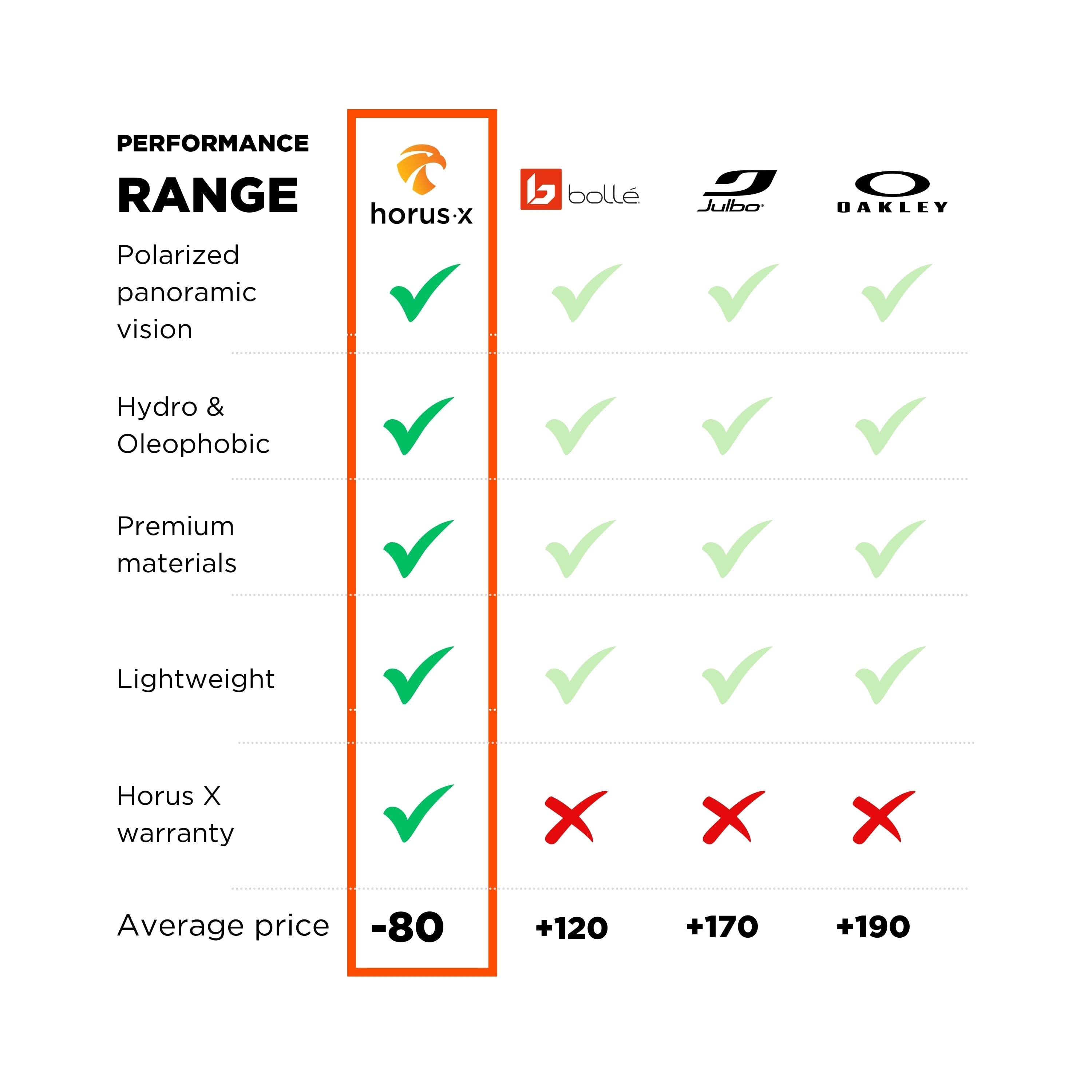Diese co-injizierten Polycarbonatgläser (DAS ballistische Schutzmaterial) sind so widerstandsfähig und langlebig wie eh und je und mit verstärkten Metallscharnieren ausgestattet. Sie profitieren außerdem von der berühmten lebenslangen Horus X-Garantie.